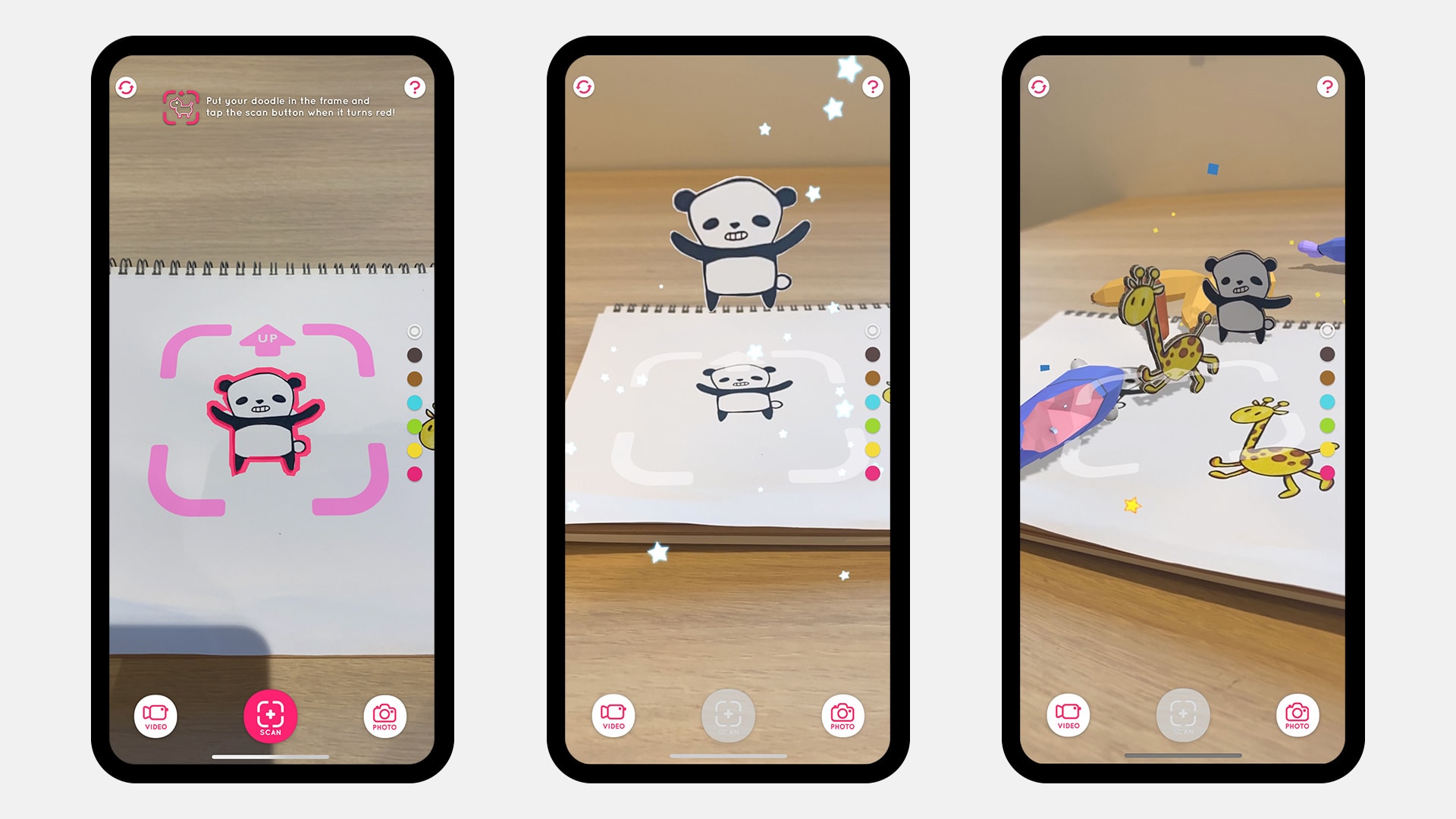 Just draw in a notebook, on a whiteboard, or on any other kind of surface, then scan your drawing with the app to bring it to life, and you can walk through a virtual space with your smartphone. Once your drawings are alive, you can try feeding them, poking them, or even teasing them a little.