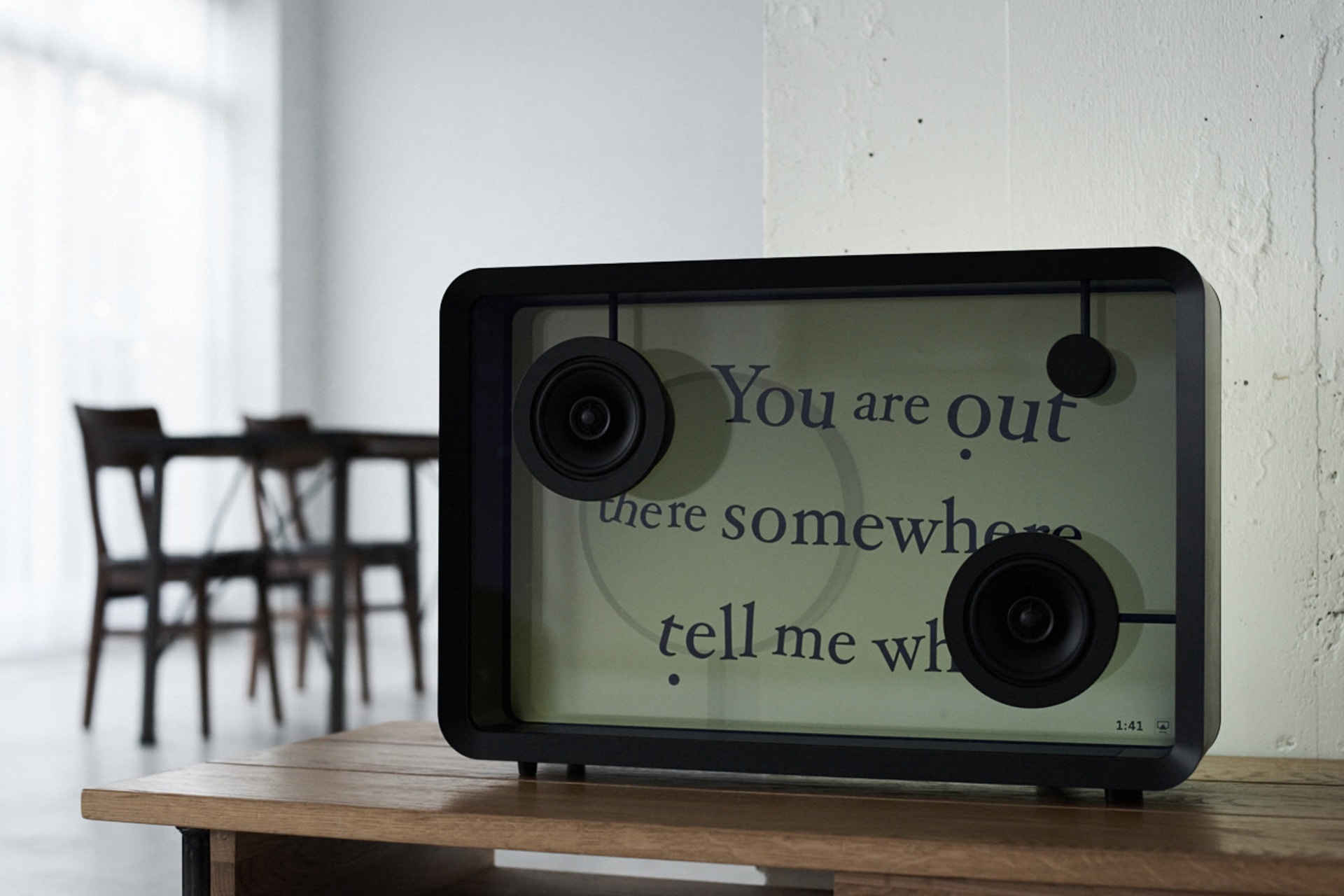 Together with SIX , we developed “Lyric Speaker”—a wireless audio speaker where the words of a song appear on the translucent glass display while the song is being played. The Lyric Speaker was created to be both a decorative piece and a new audio-visual experience.