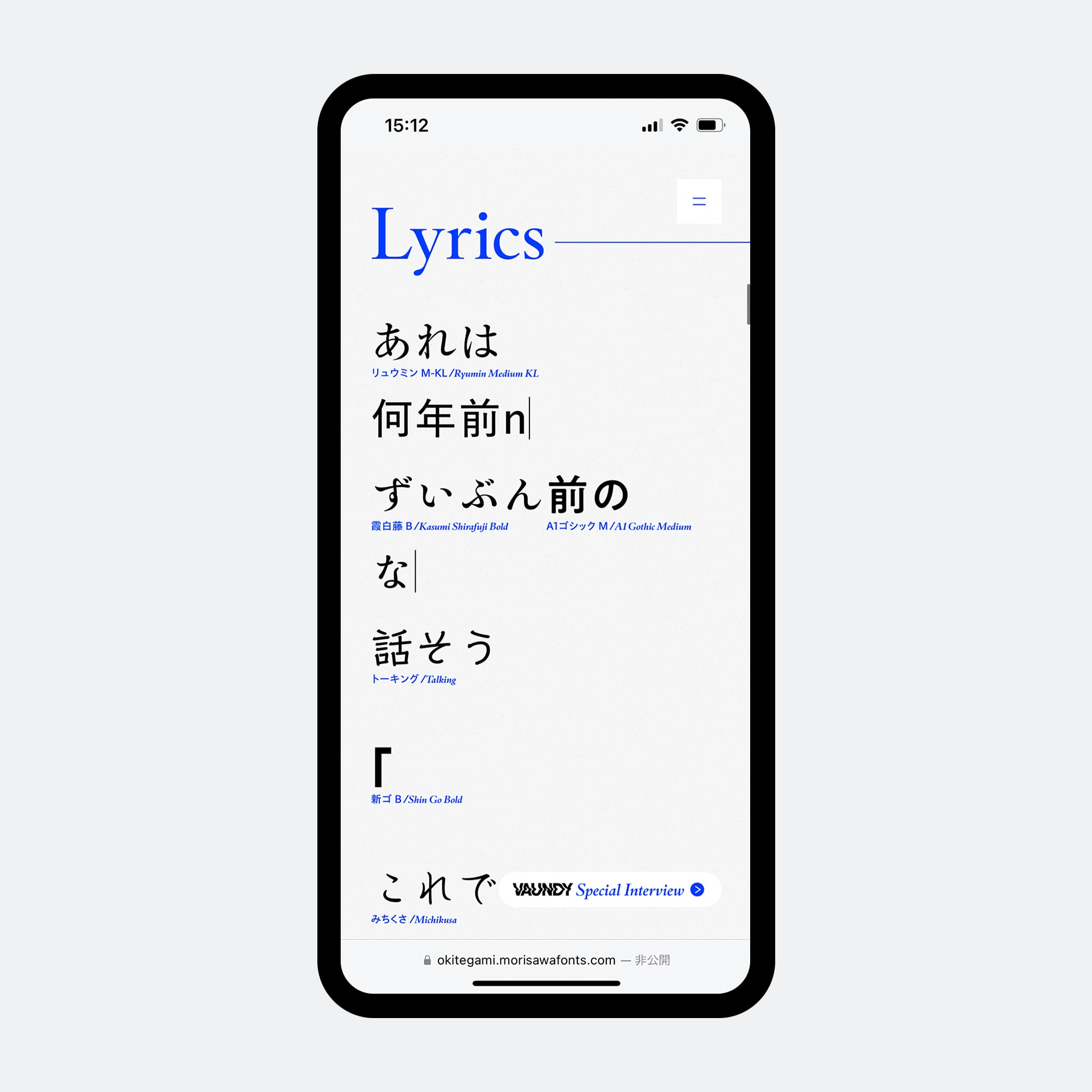This is a “Font Specimen Music Video” that uses 77 fonts, including Gothic and Mincho fonts provided by Morisawa Fonts, to breathe life into the lyrics of a song. This song “Okitegami” was specially written by Vaundy for this collaboration, and the music video spotlights the keywords within the song lyrics. Using fonts that match the meaning, weight, fragility, and strength of the lyrics, this music video is dynamic and expressive in showcasing the meaning and emotions behind the lyrics.