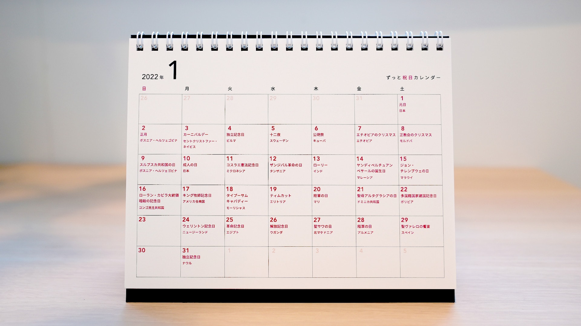 We worked with Ken Kawamoto to develop the “Always Holiday Calendar,” which lists holidays around the world. The calendar includes holidays in over 200 countries, including Japan, the U.S., Spain, France, Ghana, Turkmenistan, etc. It is a happy calendar that will make you feel like every day is a holiday, almost 365 days a year. It is produced and sold in limited quantities every year.