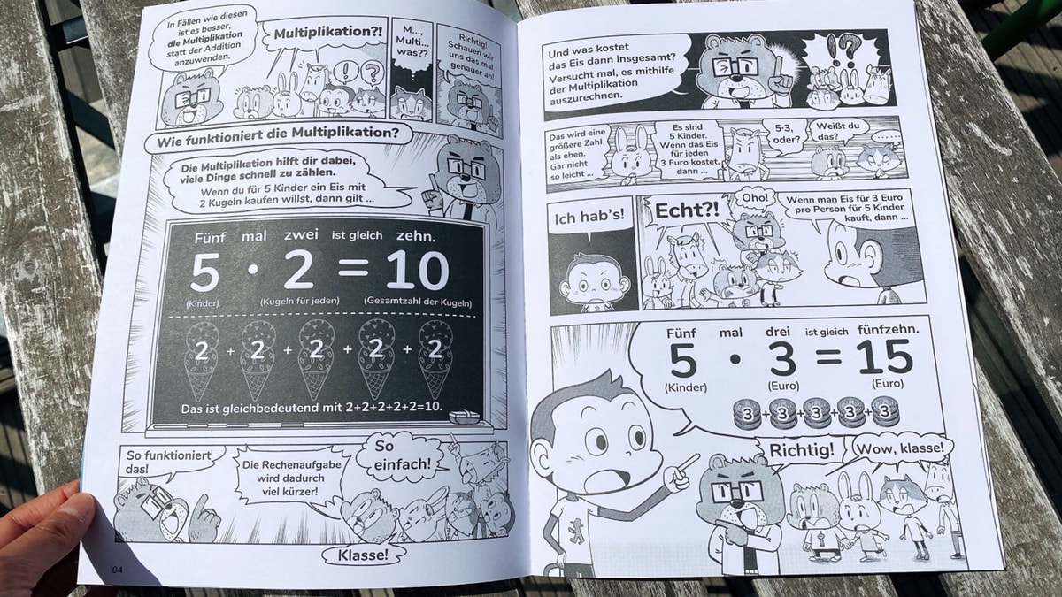 The comic book was designed under the supervision of elementary school teachers in Berlin to make arithmetic familiar to kids. The math equations they encounter in daily lives were woven into its storyline to make it easier to digest, with both text and diagrams.