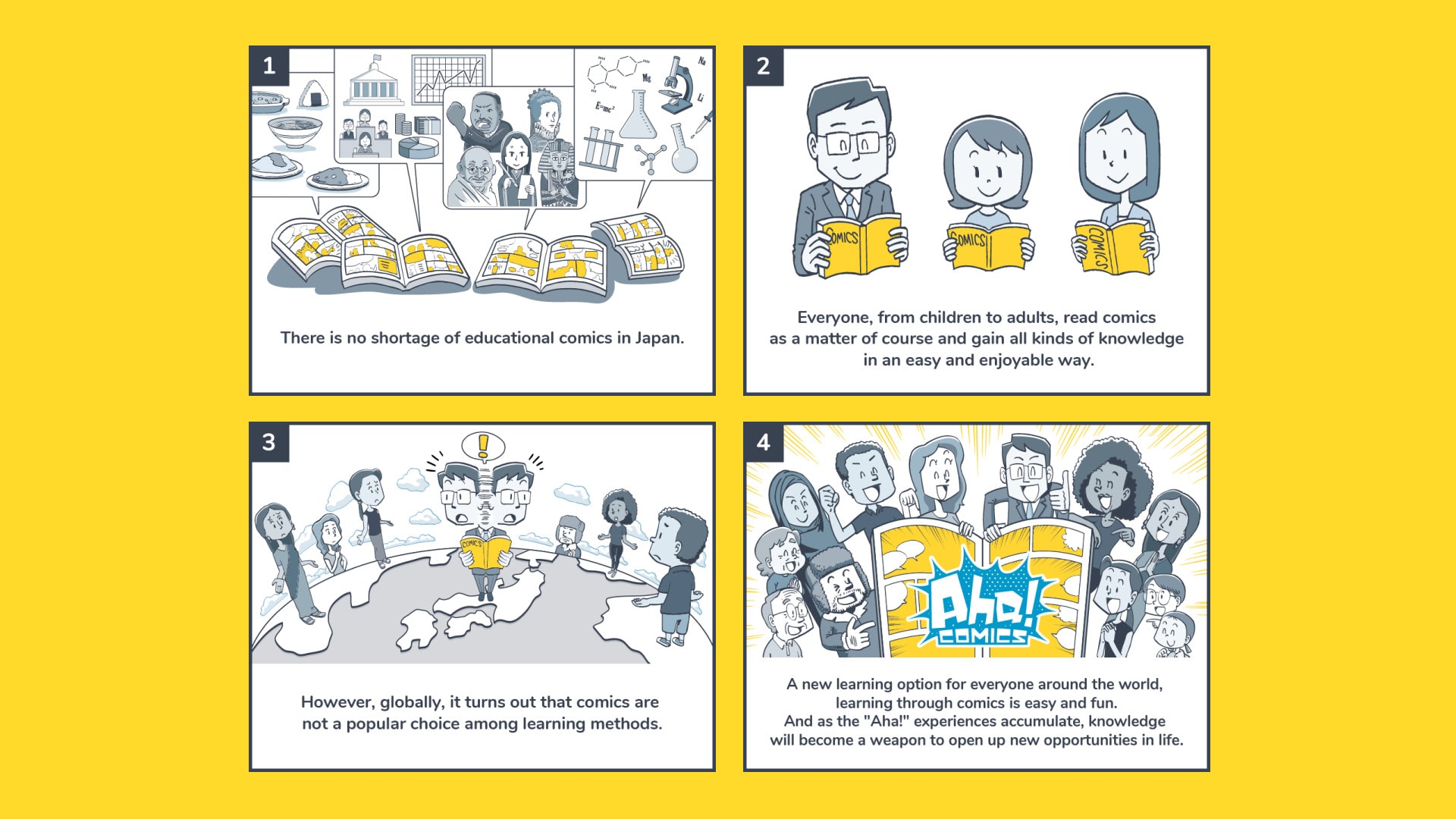 If textbooks were in a comic book format, it would give you a more accessible learning experience with “Aha!” moments. That is the idea behind the “Aha! Comics,” a newly launched service that aims to make such comics available worldwide, raising the education level globally. Whatever Inc. is involved in planning, service branding, logo design, and overall creative supervision.