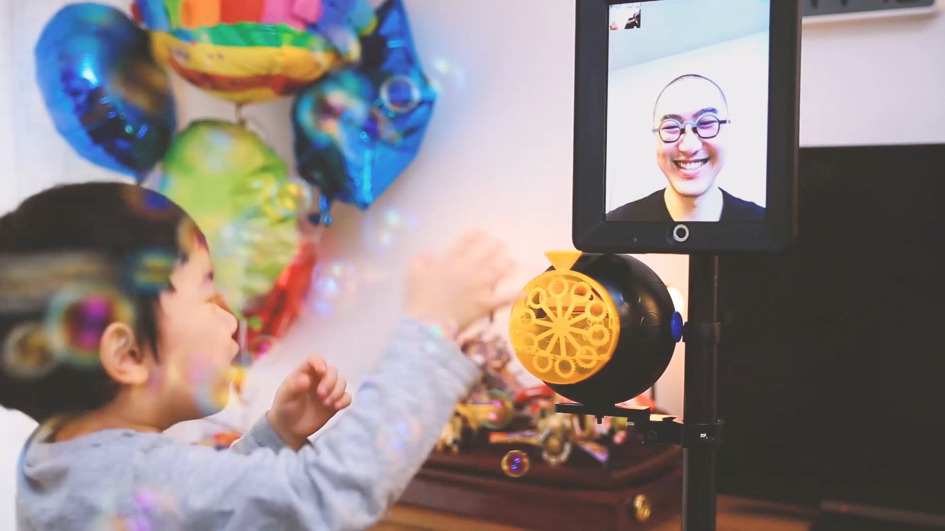 We created the system in-house, inventing three kinds of attachments and a control app: TeleBubble emits bubbles, TelePong fires ping pong balls, and TeleBucks shoots out money.