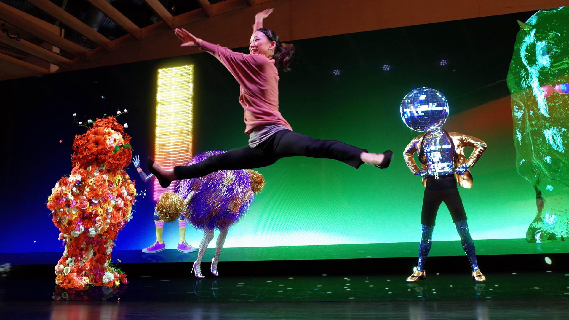 Each character was designed with a unique quality of Crystal LED Integrated Structure in mind, such as “Flowerman” representing the impressively abundant range of green colors the display can recreate. All of these characters were modeled in 8K quality combined with motion-captured data of actual dancers, and displayed life-size on a 9m wide screen.