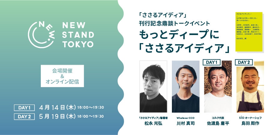 A two-day talk event will be held at New Stand Tokyo to celebrate the publication of “Sasaru Idea” a book containing interviews with 15 top creators active on the front lines and their methods, know-how, and philosophy!