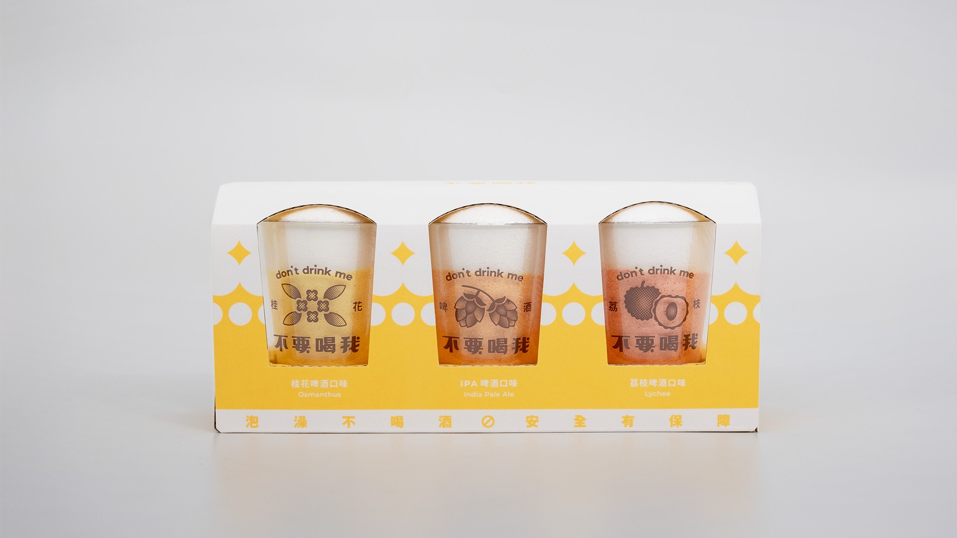 Inspired by the drinking culture at Taiwanese stir-fry restaurants, we developed three kinds of flavor: the IPA, the lychee beer, and the osmanthus beer. The bath bombs capture the essence of classic Taiwanese beer through their iconic aroma and realistic look. We even recreated the shape of beer foam. Moreover, each bath bomb is wrapped in a specially designed retro-style beer glass, which is reusable after the bath.