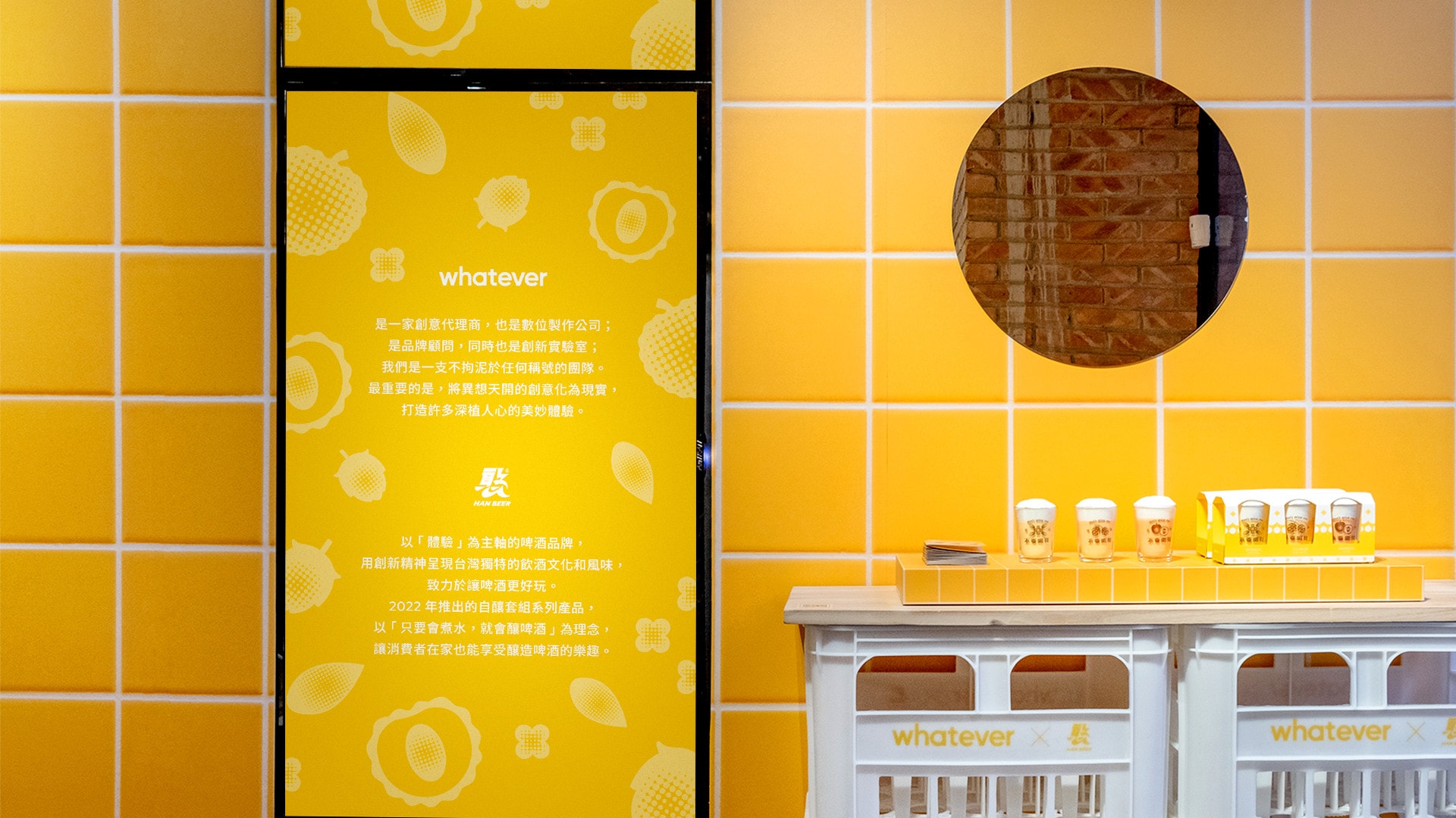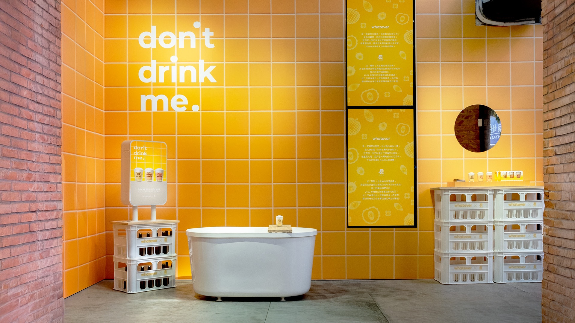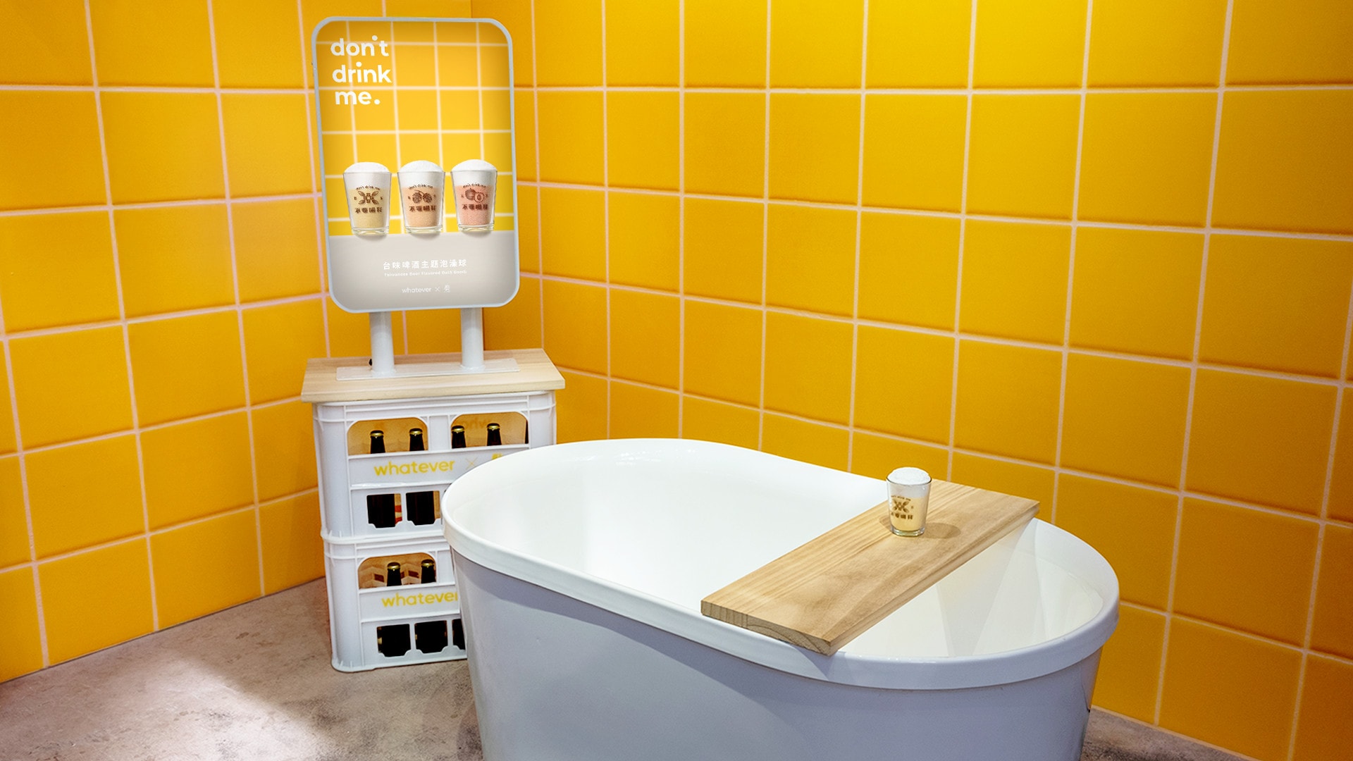 To celebrate the product launch, we also produced a pop-up showcase unveiling an immersive “Tipsy Bathroom” experience. Visitors can snap photos in a bathtub surrounded by beer-hued tiles and enjoy a scent-tasting session at a sink creatively built from stacked beer crates. Just a friendly reminder—don’t drink it!