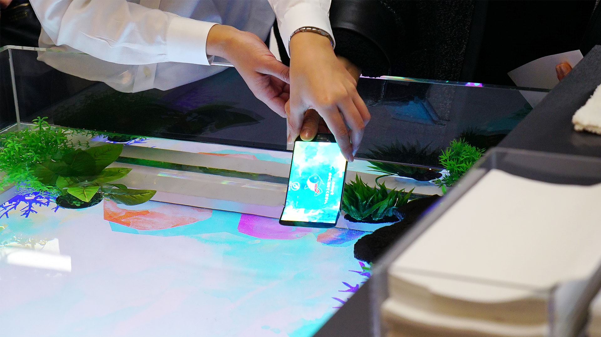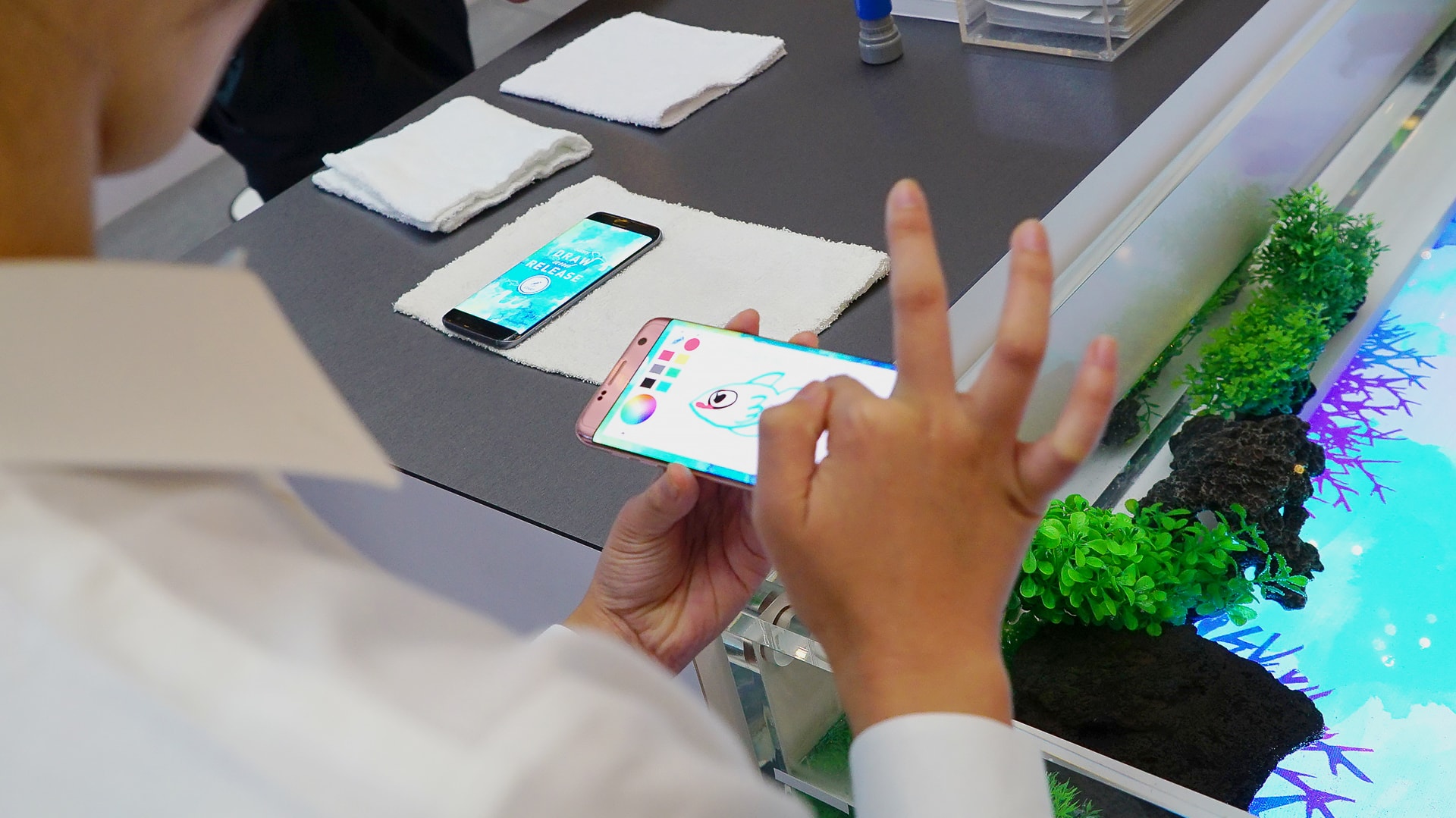 We were responsible for the technical direction and front end system development of the interactive content, which allowed visitors to experience the Galaxy S7 edge’s water-resistant feature by watching fish drawings on screen transfer onto the surface of a water tank when submersing the phone into water.