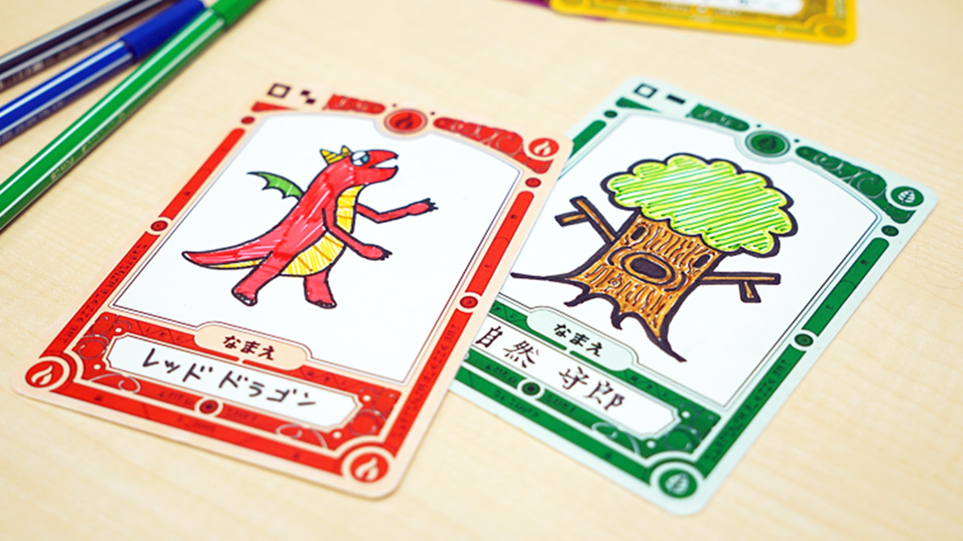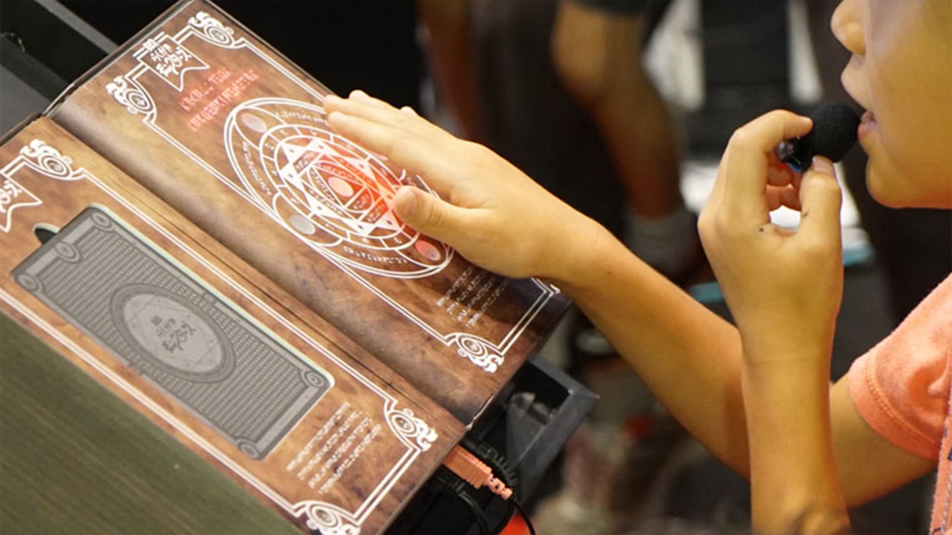 “The Doodle Monsters” allows the user to create their own monsters to take part in a virtual duel. To play, the user draws a monster character on a special card and sets it on a spell book. For the monster to appear on screen, the player has to summon the character by yelling through a built-in microphone. Once the duel commences, players fight each other by controlling their characters through voice command and by placing their hands over the book.