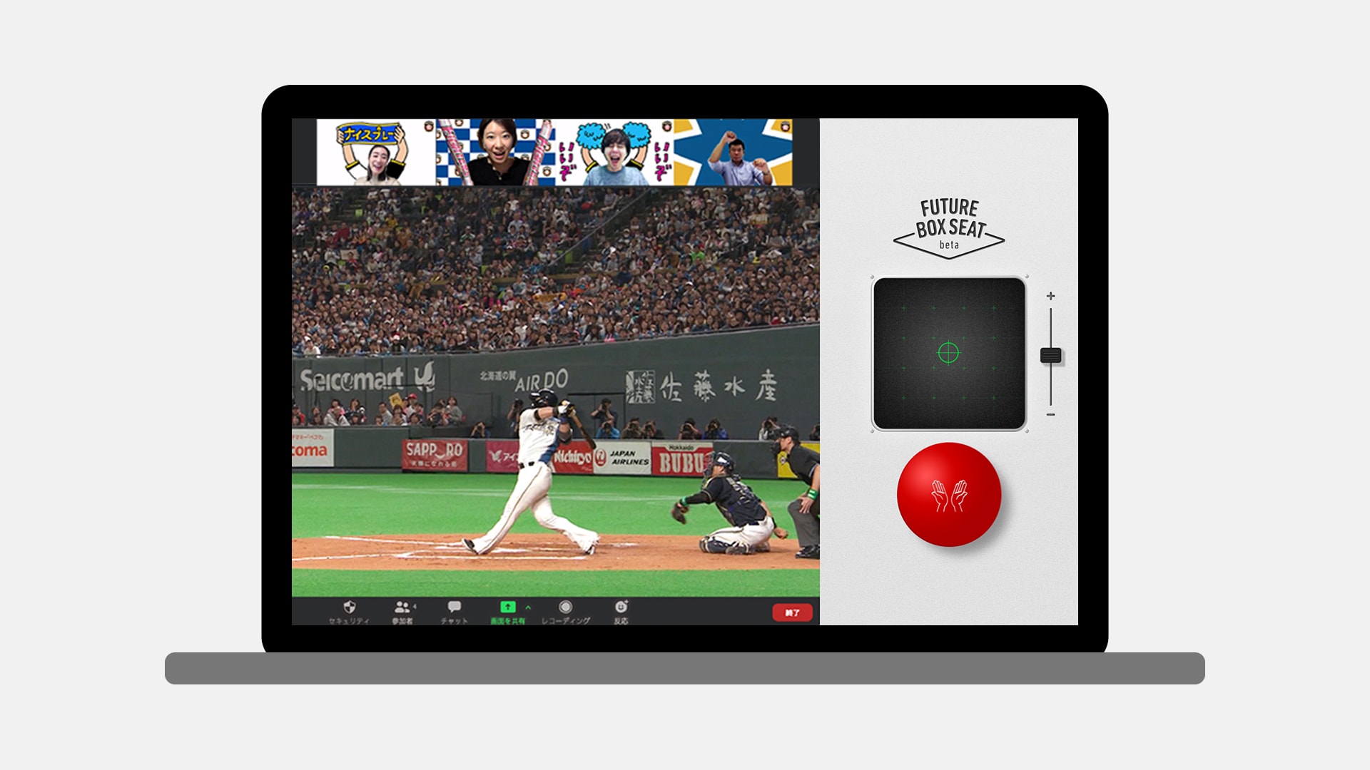 “Future Box Seat (Beta)” is a system designed to deliver a game viewing experience that makes you feel as if you were at the stadium. It allows you to remote control a robot to give a round of applause to the players. You can also freely move the 360-degree camera mounted on the robot’s head to get the venue’s feel. The robot can even show your face on the attached monitor and lets you enjoy talking to the players remotely.