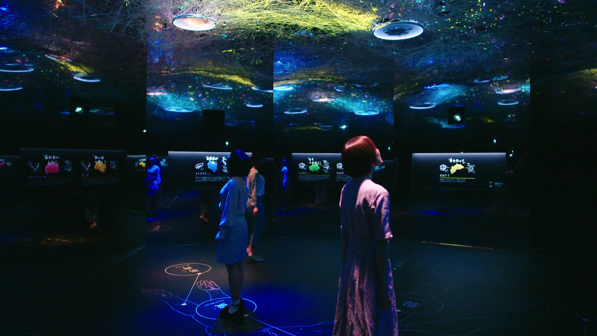 Inside the booth, major organs such as the heart, kidneys, and brain appear to float in space. Beneath each organ, you can hear messages like “I’m tired, it’s tough” or “Food is coming!” These messages are transmitted to other organs through “messenger substances” depicted as vividly colored light particles.