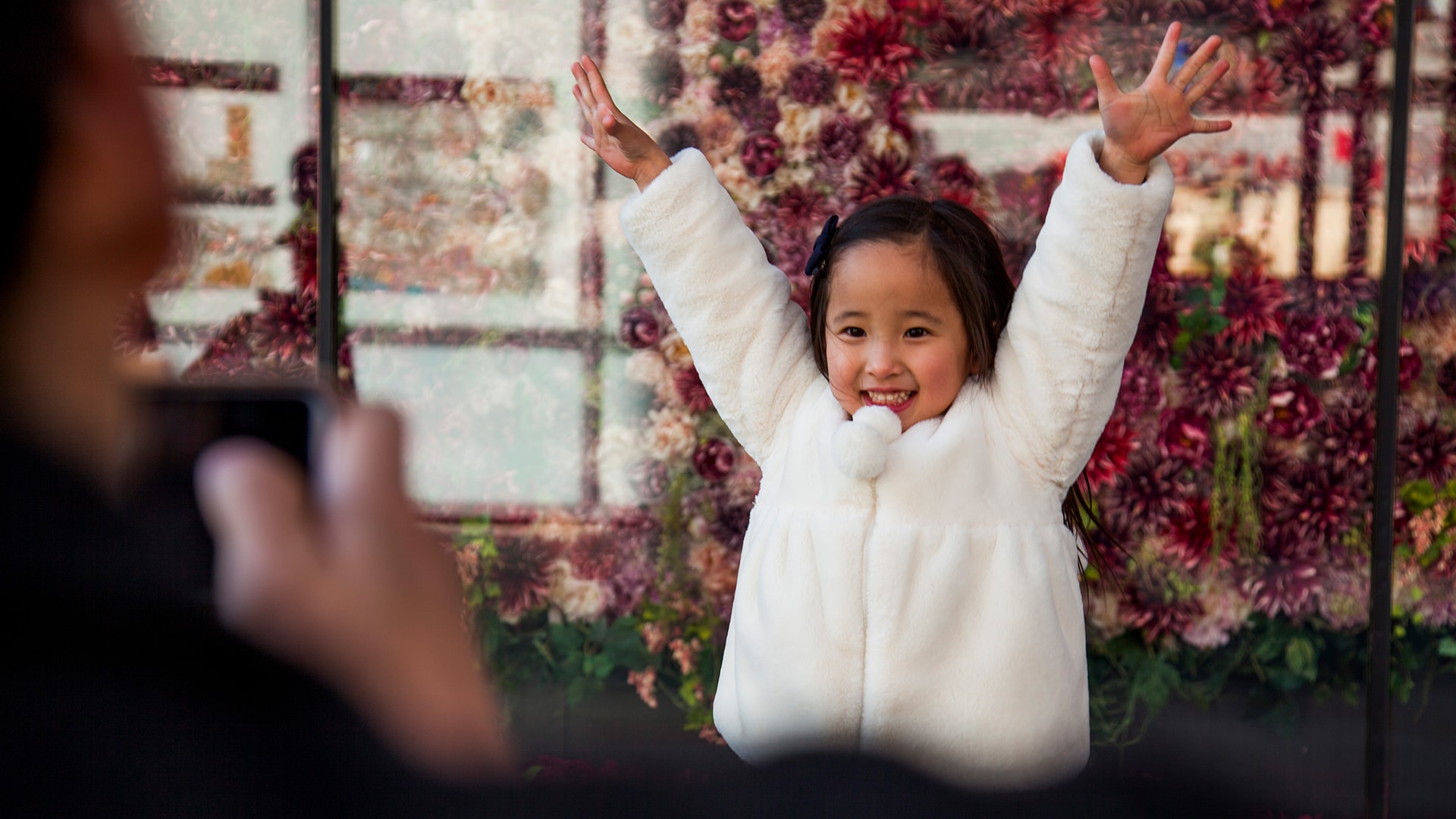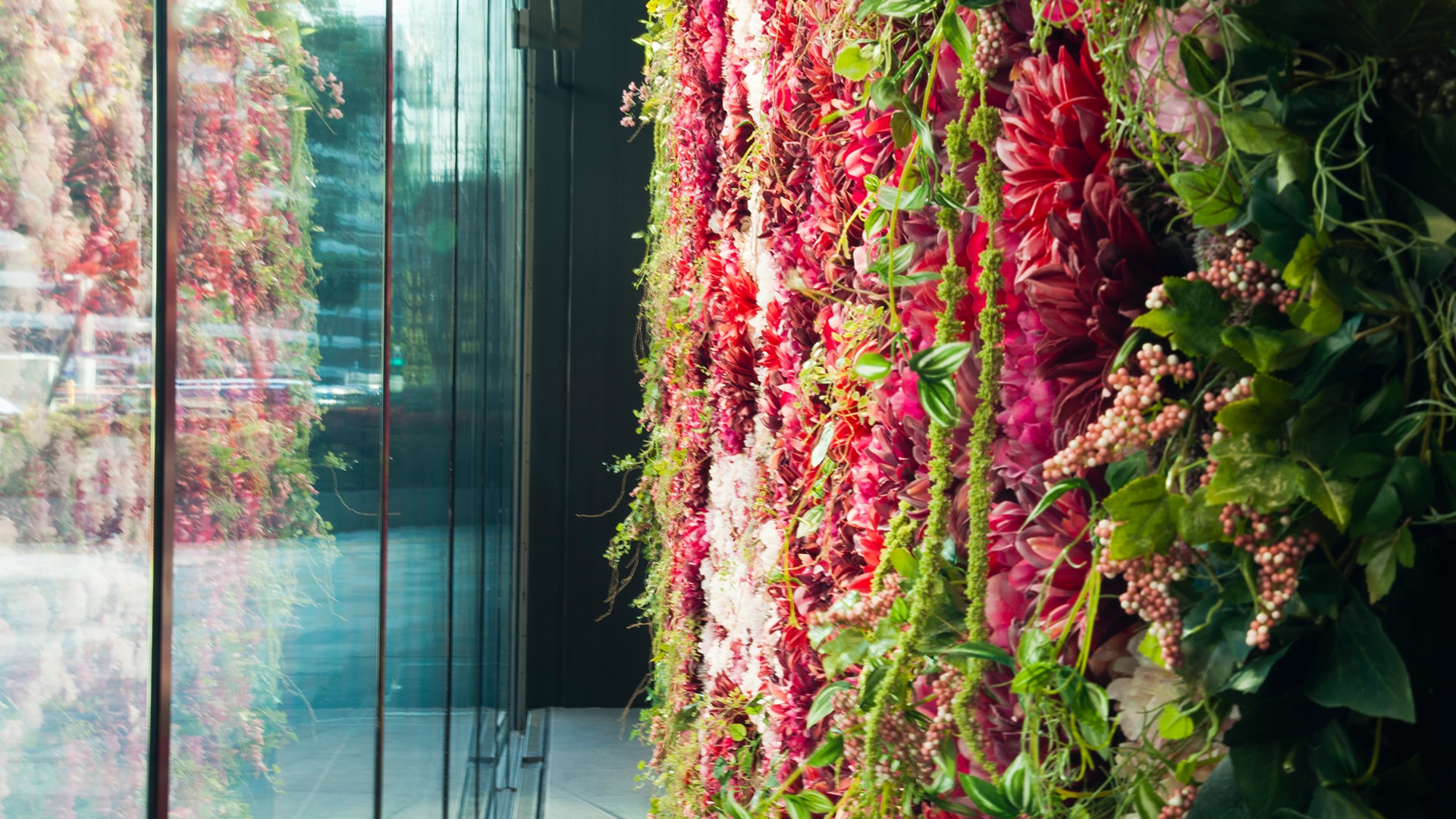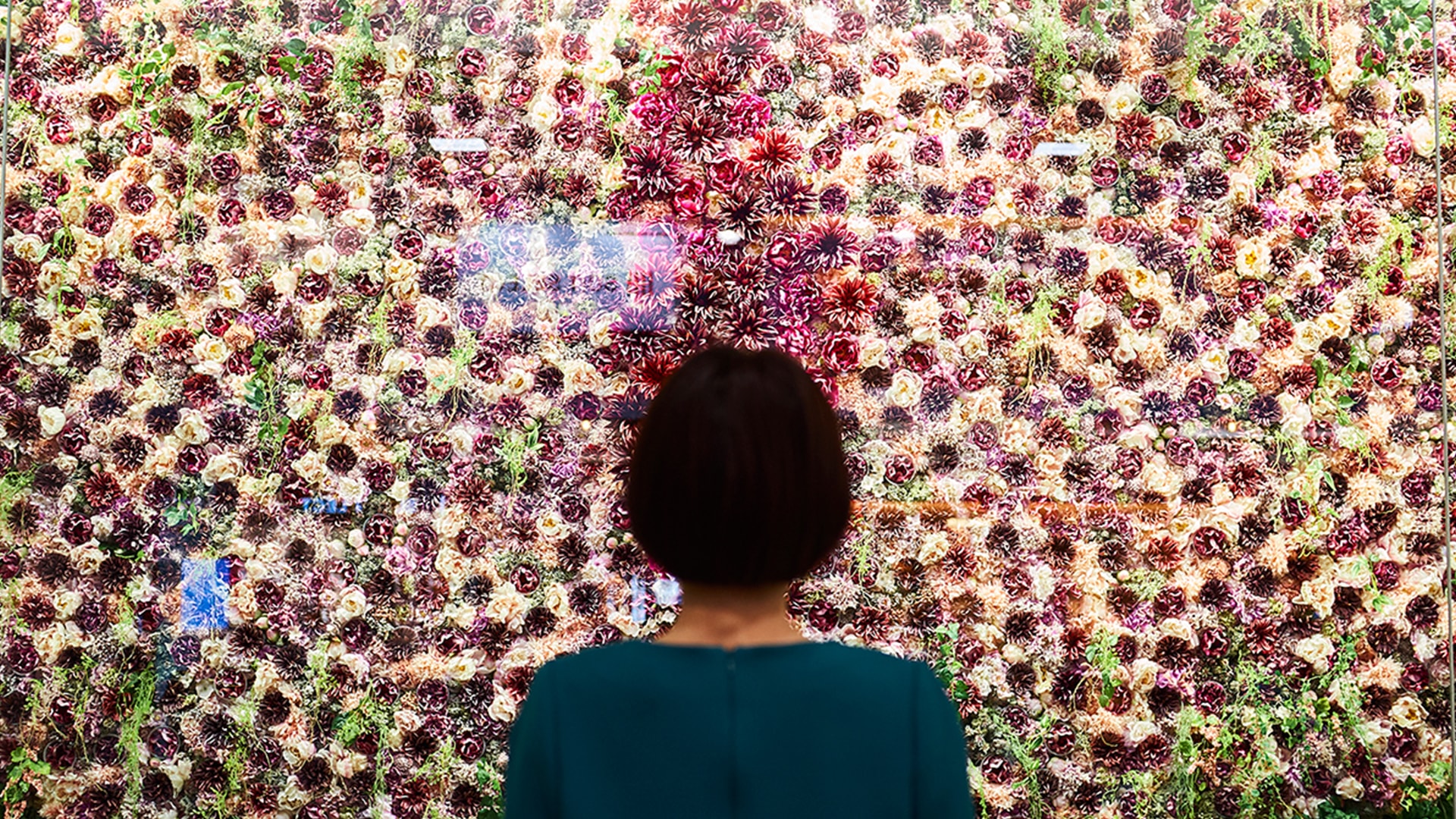 The 16.4 by 9.8 feet “Flower Mirror” was fitted with motion detection that tracked and mimicked the observer’s movements by opening and closing the 3,000 flower attachments. We also programmed the installation to display various types of shapes, patterns, and texts when on standby mode.