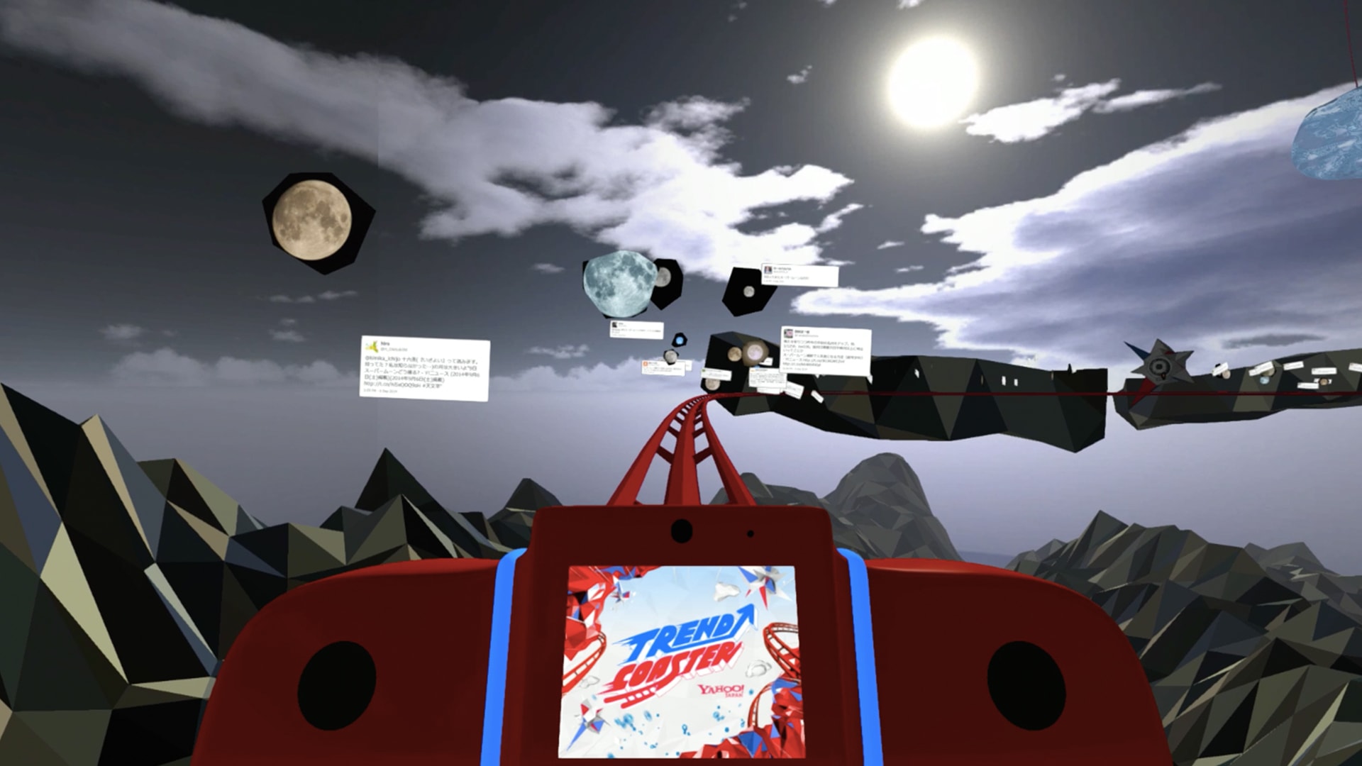 We took the changing numbers of shared posts based on a keyword shown in the form of a line graph on Yahoo’s Real Time Search and transformed it into a virtual 3D trending waveform. By putting on Oculus Rift head-mounted displays and riding in an actual roller coaster installed with the ELSACO Kolín “Motion-sim” driving simulator, riders were able to enjoy a unique, 360-degree virtual experience created by the ups and downs of a trend.